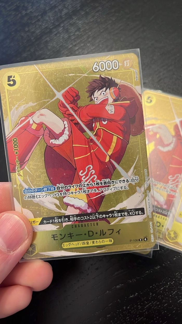 Je vends la carte Monkey D. Luffy P-106 (Promo) du One Piece Card Game. ✨ Version japonaise 📌 Référence : P-106 💪 Puissance : 6000 🎴 Carte promo officielle 🛡️ Conservée sous sleeve (voir photo) 📊 État : excellent état Superbe visuel doré, idéale pour collectionneur ou pour compléter un deck Luffy 💎 📦 Envoi rapide et soigné (sleeve + toploader + protection renforcée) 🤝 Possibilité de lot avec d’autres cartes One Piece / Pokémon (voir mon profil) 💬 Disponible pour plus de photos ou informations ! #OnePieceCardGame #Luffy #CarteOnePiece #Promo #P106 #CollectionOnePiece #TCG
