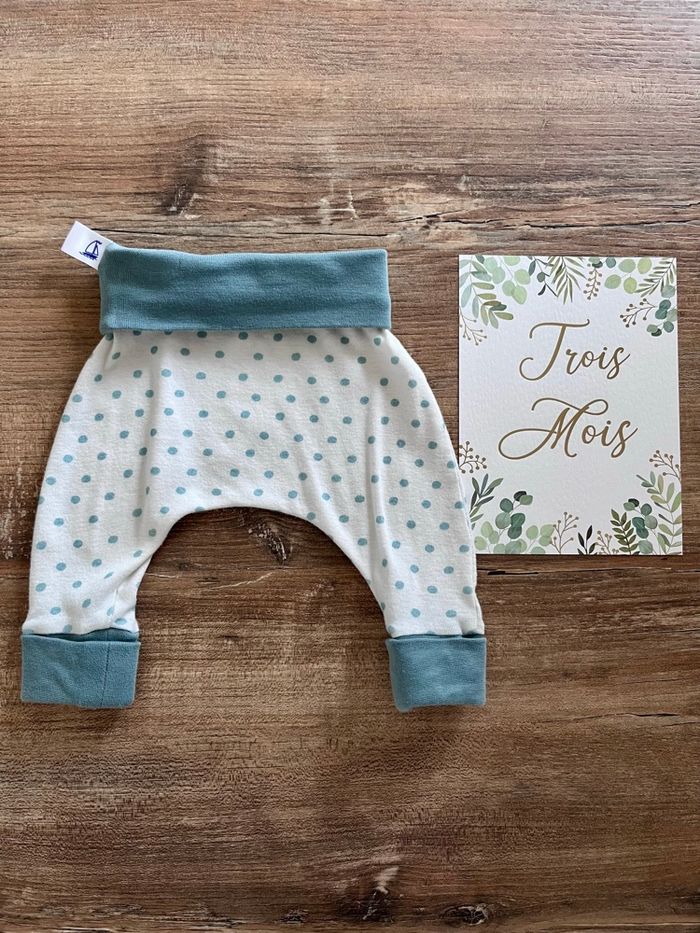 Petit pantalon type sarouel évolutif qui correspond à un 3mois puis 6 mois lorsque l’on déroule les jambes. Sans marque c’est un modèle unique car il a été créé à la main par une amie créatrice. En coton, il est en excellent état !