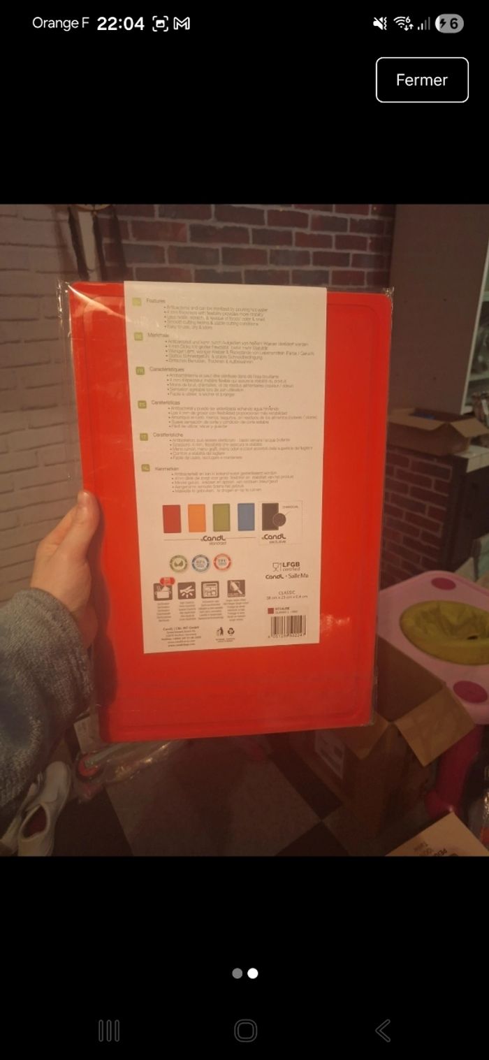 Neuf dans son emballage ✅️ Planche en thermoplastique , passe au lave vaisselle, protège les lames de couteau . Antibacterien , elle peut etre stérilisé dans l'eau bouillante . Hyper facile a sécher