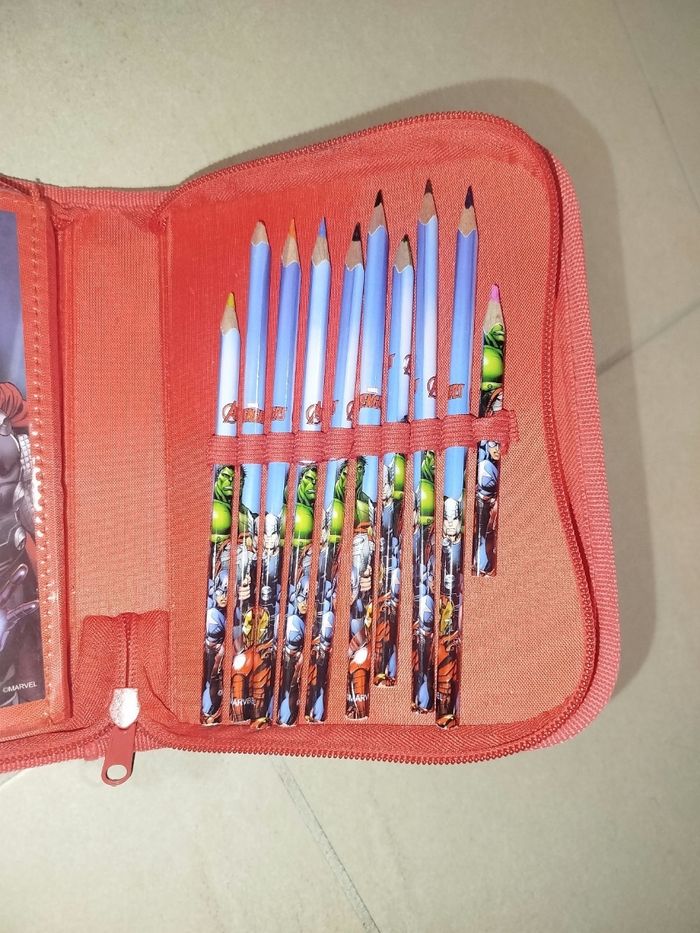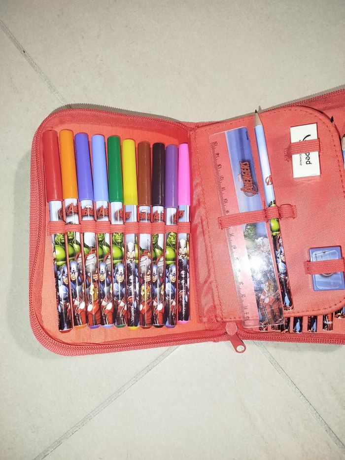 🔥 Trousse Marvel Avengers 🔥 Quasiment complet Peu servi mais certains feutres ont séché Crayons de couleurs, trousse, crayon de papier, règle, gomme, feutres fournis lors de l'achat. Bon état général 📦 Dépôt en point relais en moins de 24 heures !
