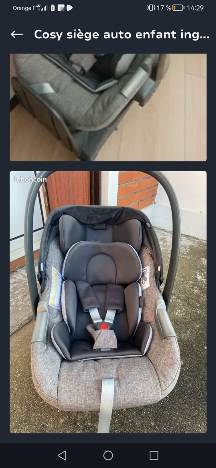 Cosy / siège auto Inglesina, utilisable dès la naissance. Équipé d’un réducteur nourrisson, il garantit un maintien parfait pour les tout-petits. Soigneusement entretenu, il est en parfait état. Prix : 60 € A récupérer sur Rungis ou aux alentours Mots clés : coque, cosy, siège-auto