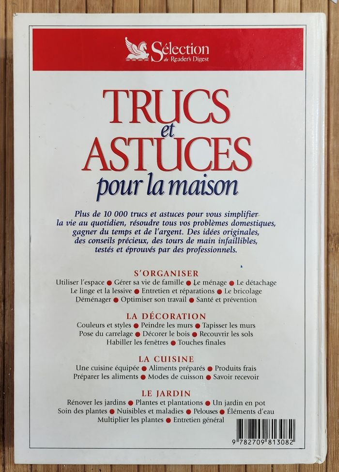Descriptif : Plus de 10 000 Trucs et Astuces pour vous simplifier la vie au quotidien, résoudre tous vos problèmes domestiques, gagner du temps et de l'argent. Des idées originales, des conseils précieux, des tours de mains infaillibles, testés et éprouvés par des professionnels.. Date de parution : 09/2001. Auteur original : Dorling Kindersley. Auteurs : C. Kent, J. Casser, P. Parham, C. France et P. Greenwood. Illustrations : K. Kang Chen, H. Marie Verrinder, J. Woodcock, D. Ashby, K. Cochrane, G. Denney et S. End. Photographies : S. Ashum, A. Crawford, J. Elliot, S. Gorton, G. Ombler et S. Tanner. Éditions : Sélection du Reader's Digest. Dimensions du livre : 25×17.8×4.6Cm. =) 672 pages. État comme neuf.