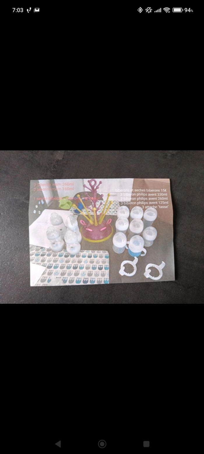 2 biberons Mam 260ml 2 biberons Mam 160ml 3 biberons Philips Avent 330ml 2 biberons Philips Avent 260ml 3 biberons Philips Avent 125ml 3 attaches tasse pour transformer les biberons en tasse 1 seche biberon (il manque un anneau)