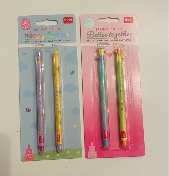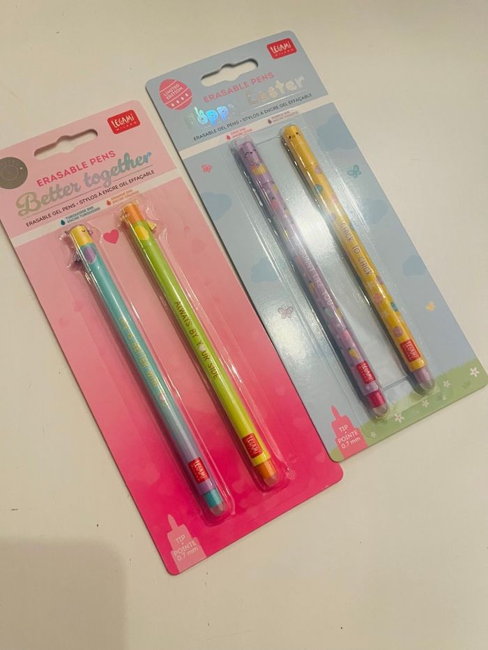 2 packs de 2 stylos effaçables Legami édition limitée Pâques 2025+ édition limitée St Valentin 2026 Neuf dans l’emballage d’origine Envoi soigné et rapide