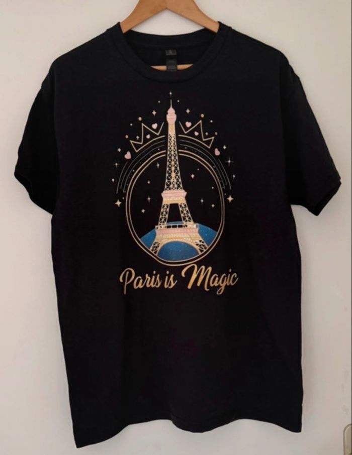 Adopte un look urbain et féerique avec ce T-shirt noir unique. Design : Illustration stylisée de la Tour Eiffel sous une voûte étoilée avec couronne et cœurs. Impression : Technique de trame à petits points pour un rendu moderne et texturé. Coupe : Coupe droite classique (Gildan), confortable et facile à porter. Matière : 100% coton de qualité. Dimensions : Largeur 56 cm / Longueur 76 cm. État : Neuf sans étiquette. Une pièce originale, introuvable ailleurs, idéale pour les amoureux de Paris ! Style : #oversize #vintage