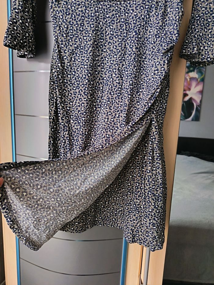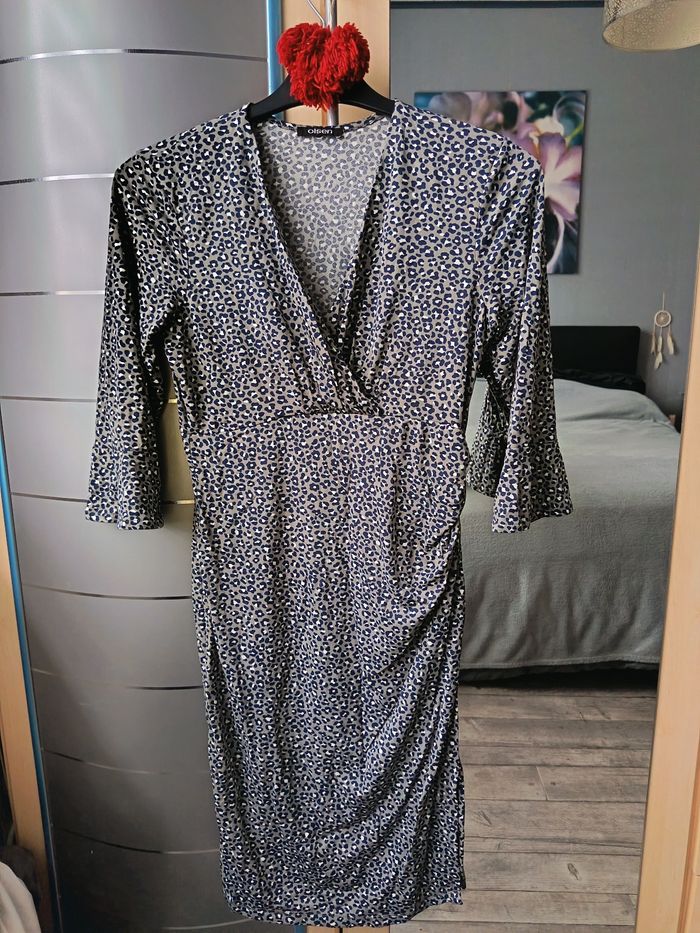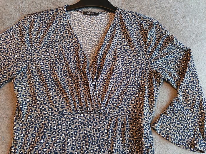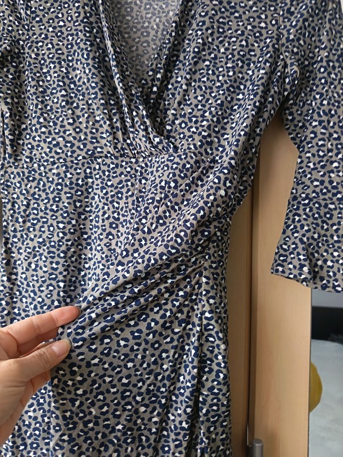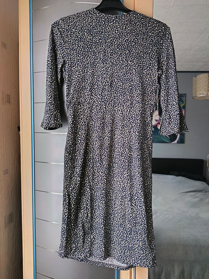 Robe taille M ceintrée, col en V, manches3/4 Robe évasé mais entièrement doublée.
