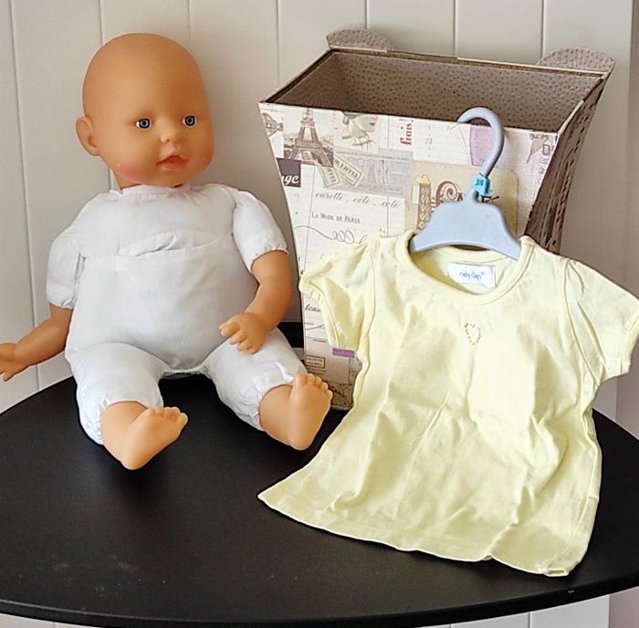 Adorable t-shirt à manches courtes pour bébé fille (taille 6 mois). Coloris jaune clair, avec un petit motif cœur en décor. Tissu léger et confortable, idéal pour la mi-saison ou l’été. 👉 Taille : 6 mois 👉 État : Très bon état (porté peu de fois, aucune tâche, aucun défaut) Parfait pour compléter une jolie tenue estivale 🌸"
