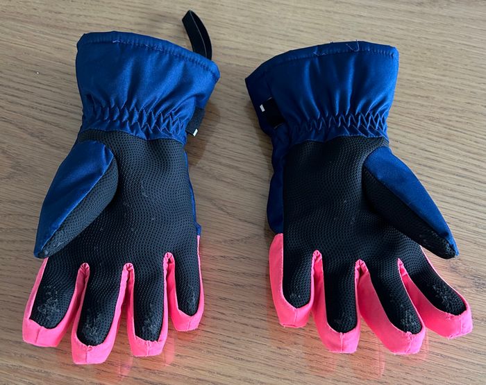 Gant de ski fille bleu marine et rose. Les dessous des bouts des doigts sont un peu usés par le frottement mais pas troués.