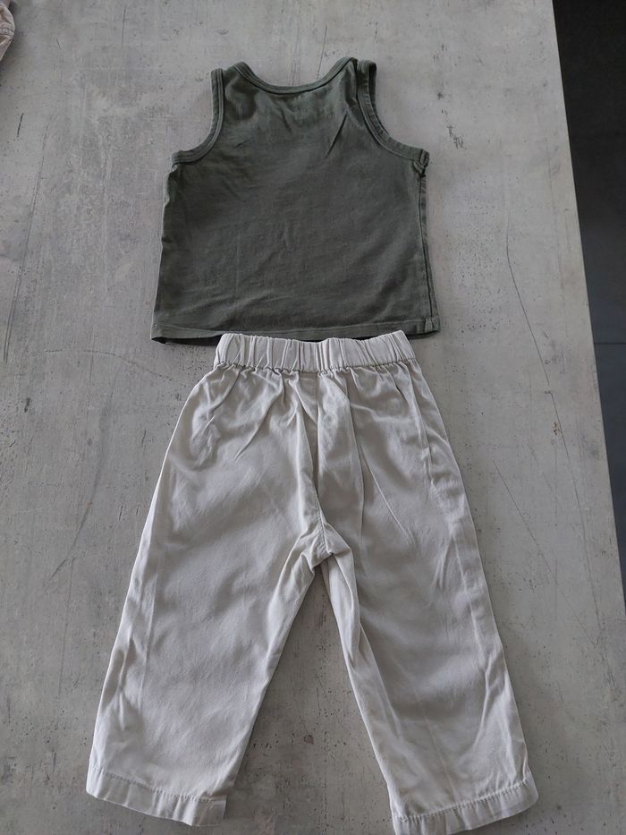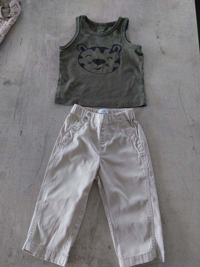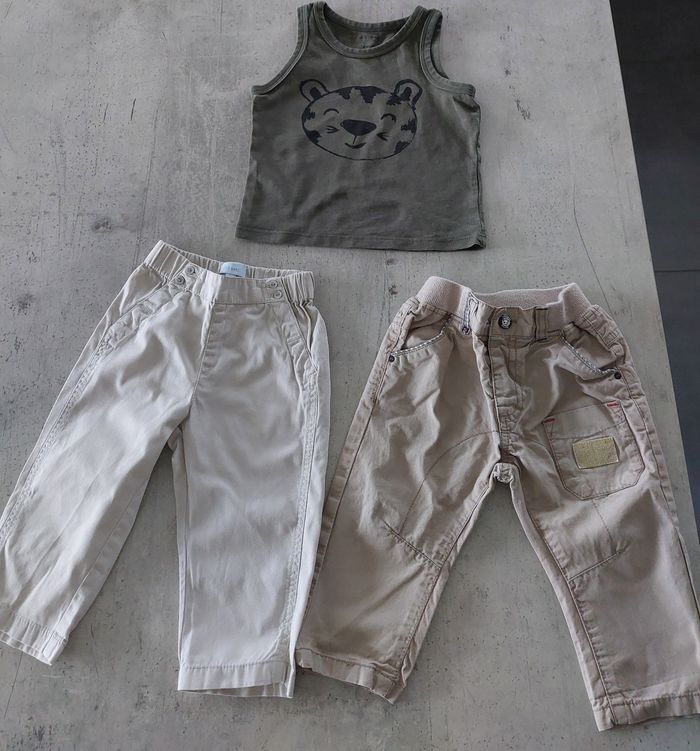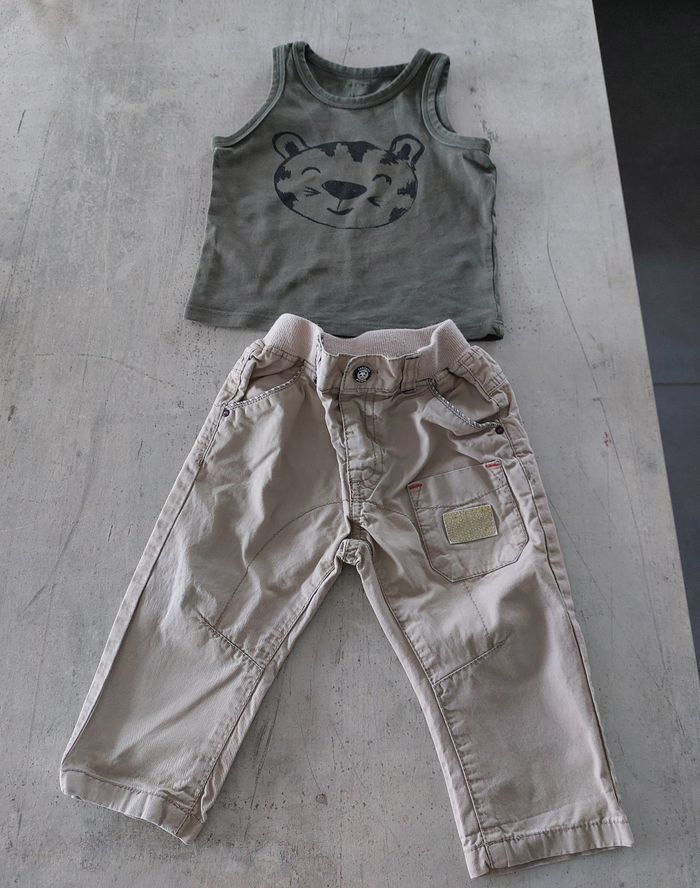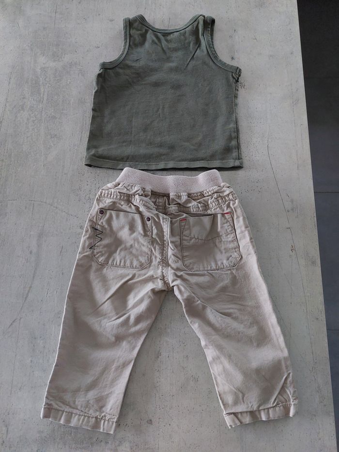Ensemble 3 pièces. Débardeur (pet et ripaton) avec 2 pantalons (Sergent major et tex baby) en 12 mois