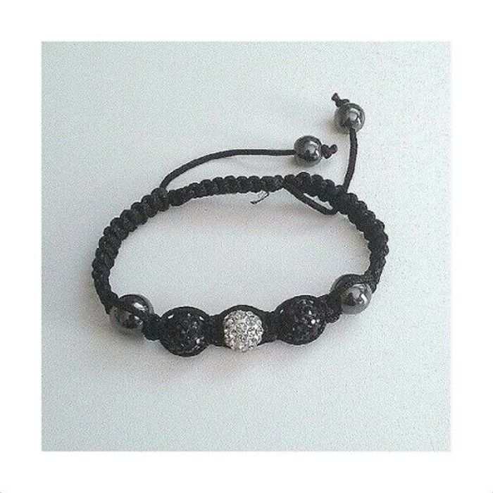 Bracelet style Shamballa, Cordon noir tressé + Hématites + 3 Perles Strass (2 noires + 1 blanche) Longueur réglable Article neuf et emballé