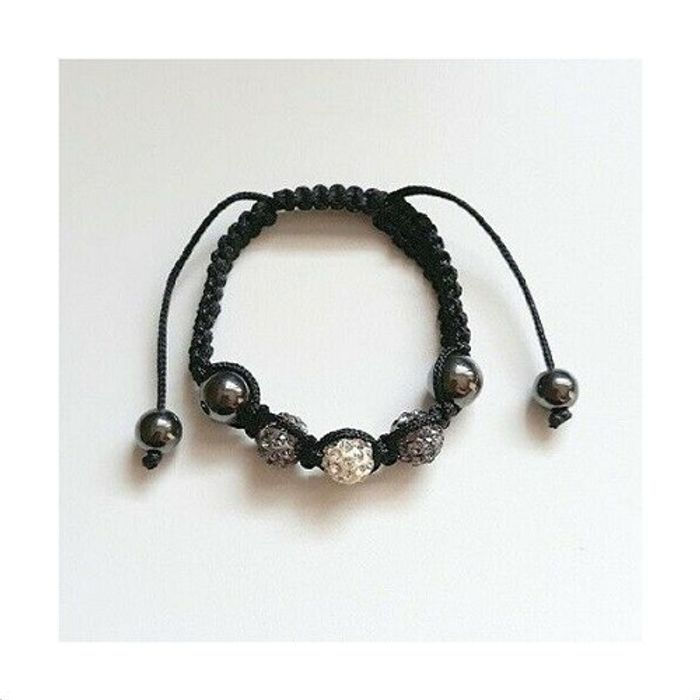 Bracelet style Shamballa, Cordon noir tressé + Hématites + 3 Perles Strass (2 grises + 1 blanche) Longueur réglable Article neuf et emballé