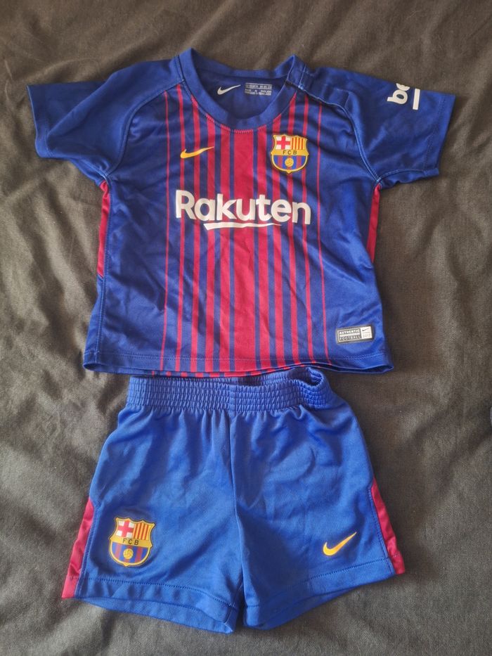Ensemble maillot et short de foot fcb Très bon état Taille 12/18 mois Un minuscule morceau sur le signe nike est parti voir photo