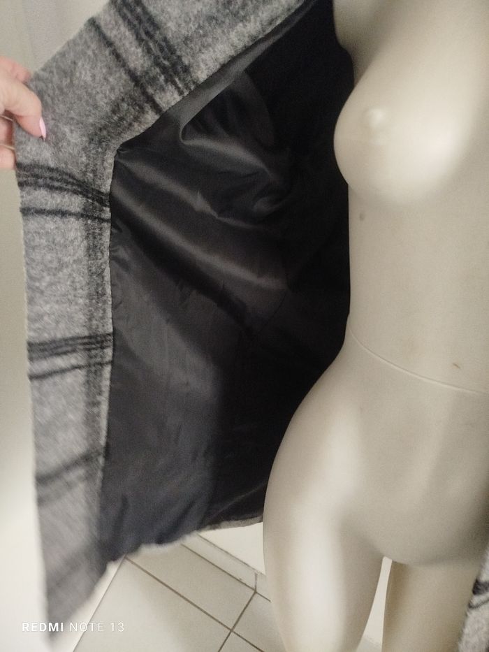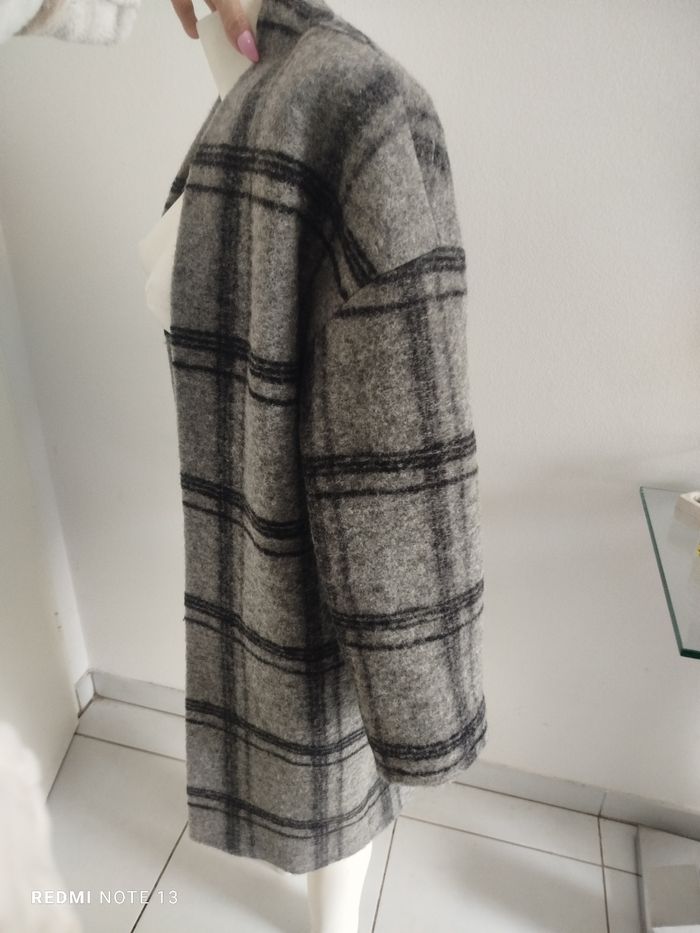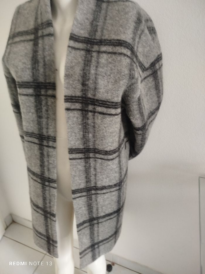 #kytie40femme. Veste manteau taille 40 devant esprit en état neuve de couleur gris et noir 25 % polyester dans la doublure 100 % polyester effet cachemire n'a pas de poche et ne se ferme pas pour ceinture vous pouvez mettre une petite ceinture fine pour le fermer mesure des épaules 56 cm des aisselles 55 cm hauteur 95 cm réf A5