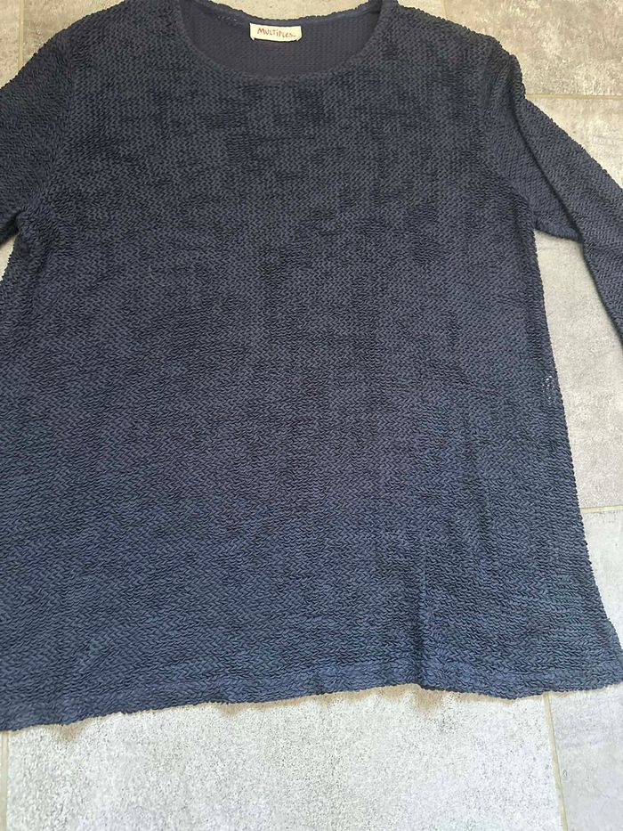 💫💫💫💫 Une MERVEILLE !!!!! en PARFAIT état, état comme NEUF Sublime tunique/haut de chez MULTIPLES , carrément SPLENDIDE Taille 2 correspond à un 42 , 44 46(voir mesures juste ci dessous) Quelques mesures prises à plat Longueur : 69 cm Carrure 49 cm D'aisselle à aisselle : 58 cm Matière extrêmement agréable : 95 % acétate et 5 % polyamide Coloris marine Vêtement vraiment terriblement élégant Une VÉRITABLE splendeur : un vêtement incontournable Pas besoin de repassage