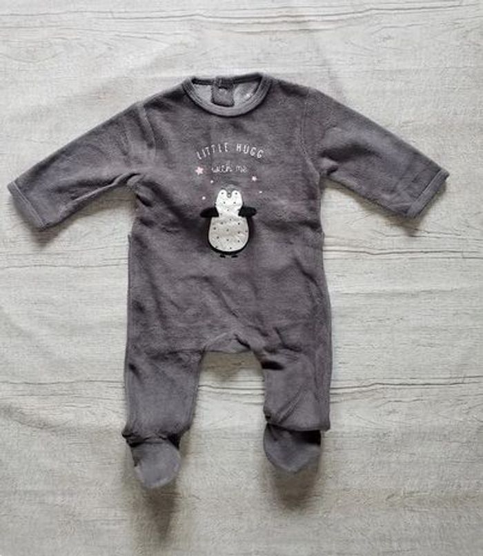 Grenouillère velours Kiabi fille, taille 3 mois, couleur grise, manches longues, encolure arrondie, pingouin imprimé et lettrage devant, ouverture pression au dos. Excellent état.
