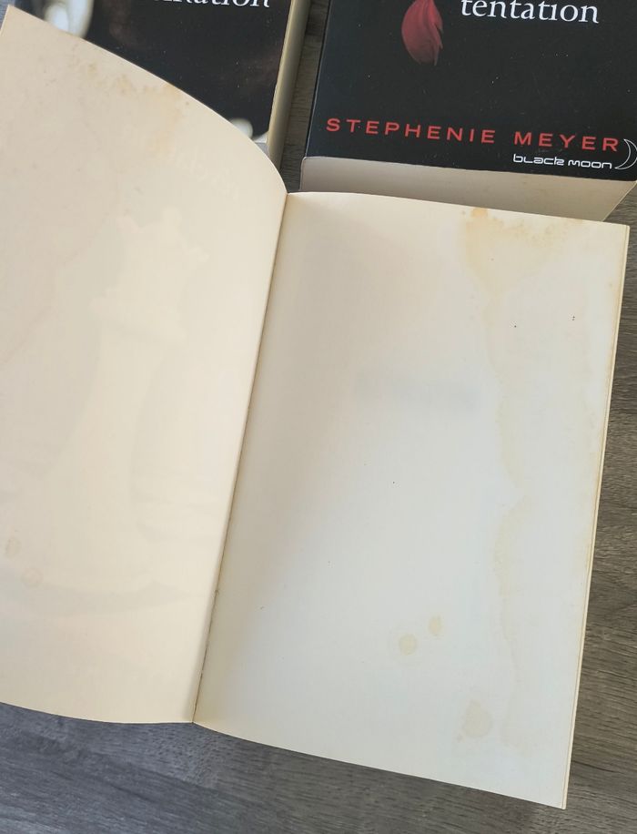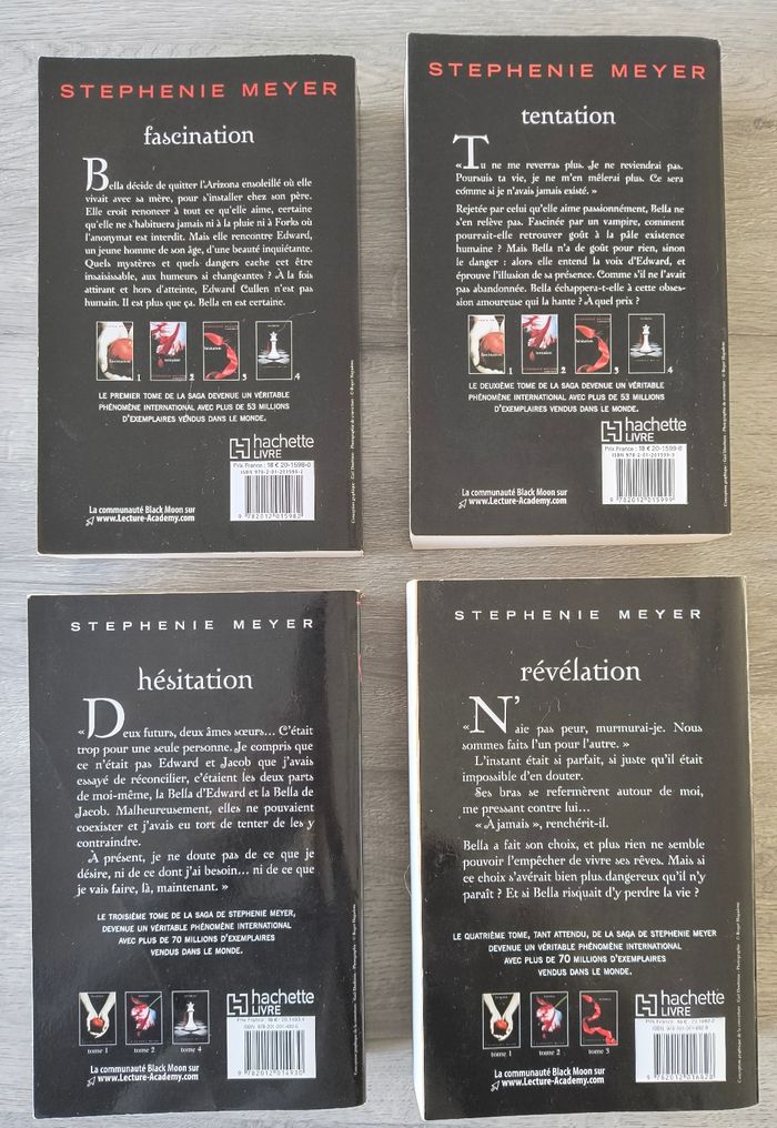 Lot complet de la saga Twilight en édition Black Moon. Les quatre tomes sont en très bon état général : intérieur des pages impeccable, aucune déchirure, aucune écriture. 📚 État extérieur Les bords, ainsi que la première et la dernière page de chaque tome, présentent un léger jaunissement dû au temps et à l’exposition au soleil — rien d’anormal pour cette édition, et cela n’affecte absolument pas la lecture. 🎨 Couvertures Les couvertures iconiques sont en très bon état, couleurs encore bien nettes. Les livres ont été soigneusement stockés et manipulés. Lus uniquement 1 fois et mis dans la bibliothèque. 💫 Idéal pour - compléter une collection Black Moon - offrir à un fan de la saga - redécouvrir l’histoire dans son édition française la plus emblématique Envoi rapide et soigné 📦 Tome 1 Fascination Tome 2 Tentation Tome 3 Hésitation Tome 4 Révélation