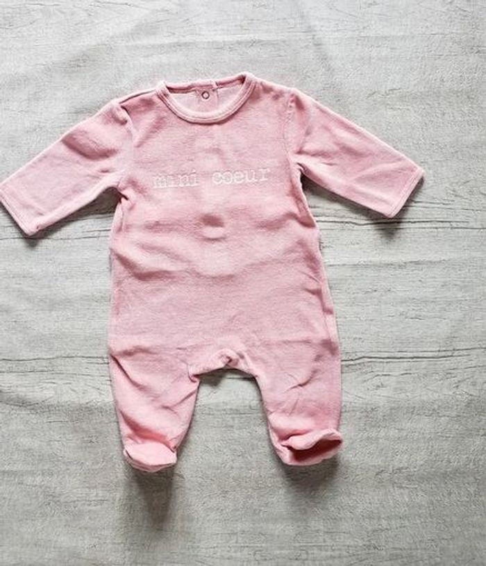 Grenouillère velours Kiabi fille, taille 3 mois, couleur rose, manches longues, encolure arrondie, lettrage sur le devant « Mini cœur », ouverture pression au dos. Excellent état.
