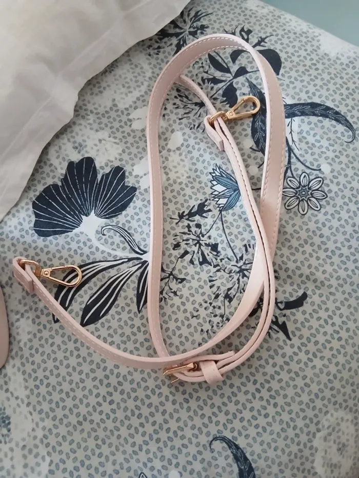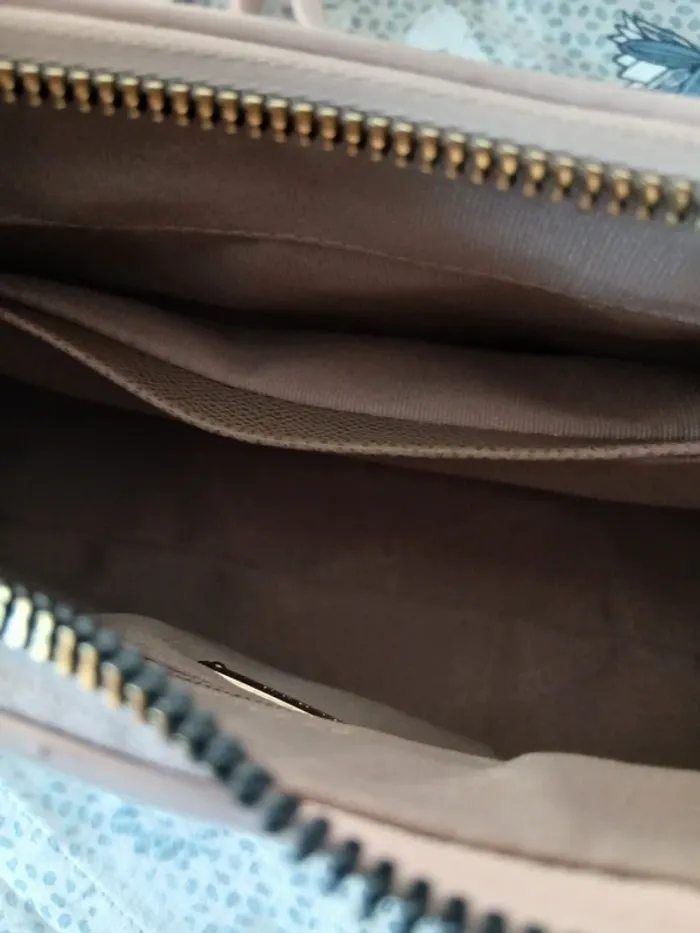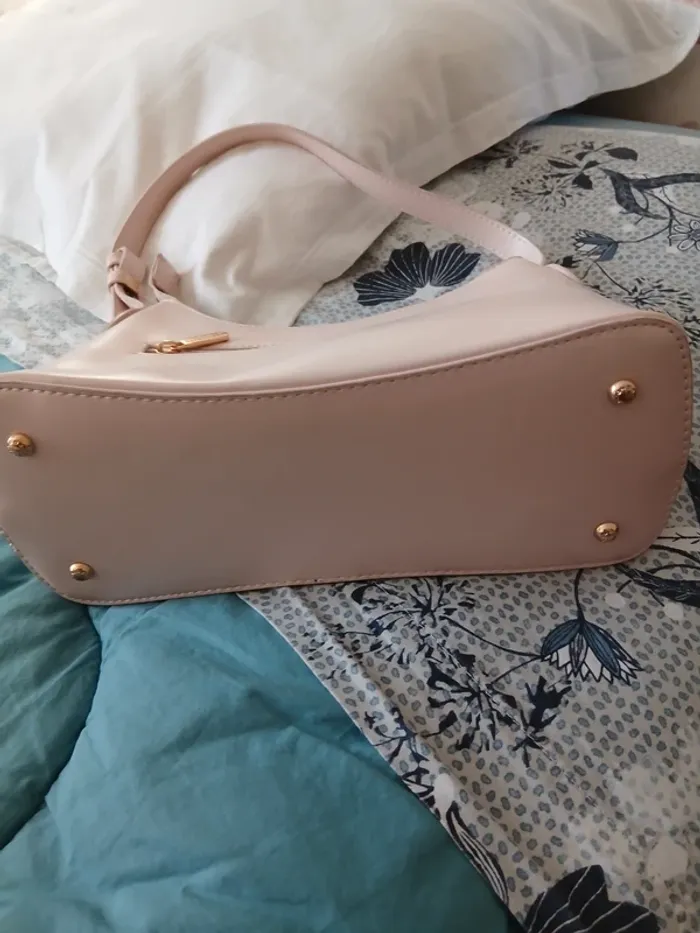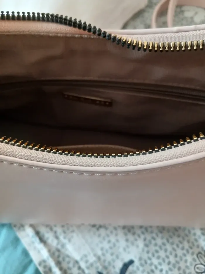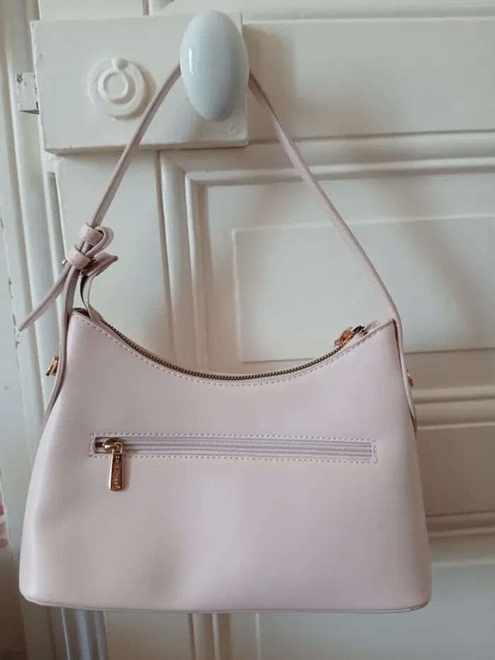 Collection printemps été, marque david jones, porté épaule, couleur rose pâle, matière synthétique, avec bandoulière, une poche zippée à l'extérieur plus une autre zippée à l'intérieur plus une normale, dimensions : 28x21x12, très bon état