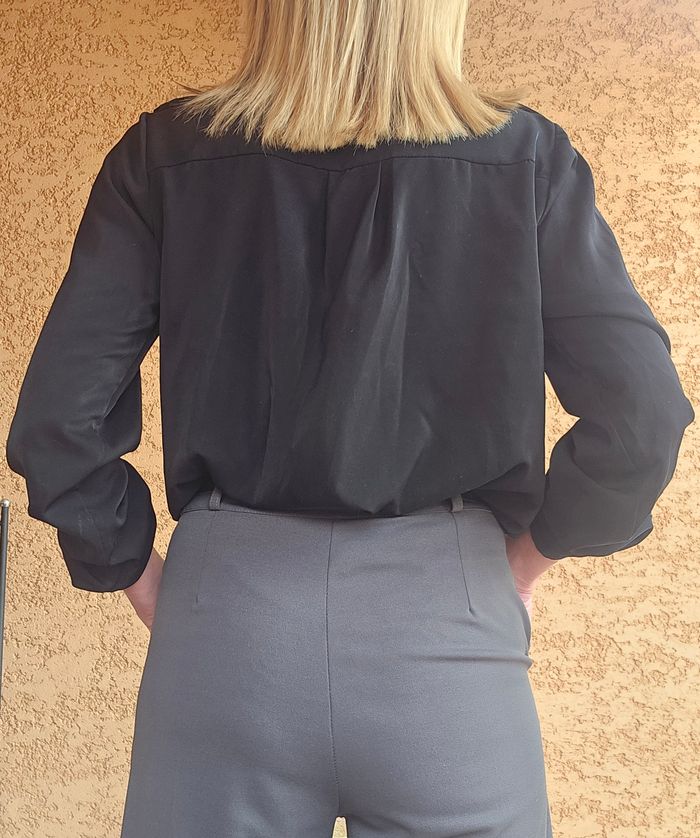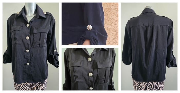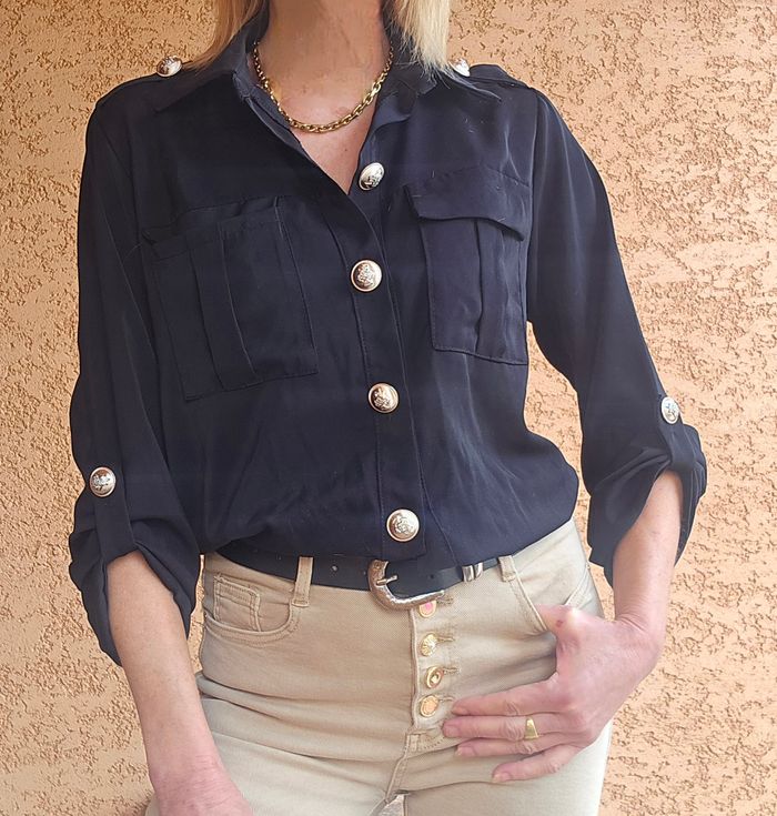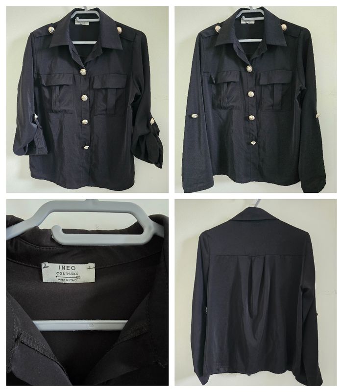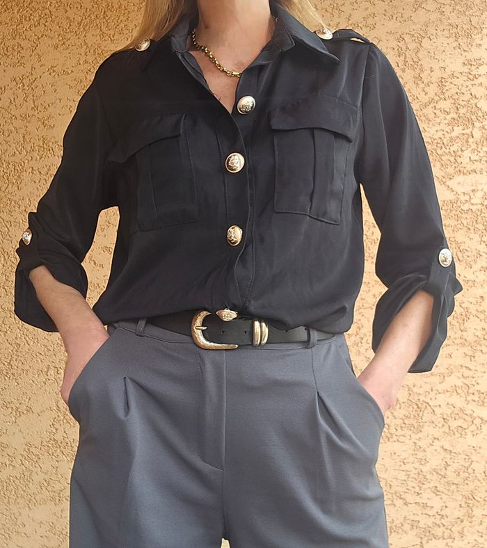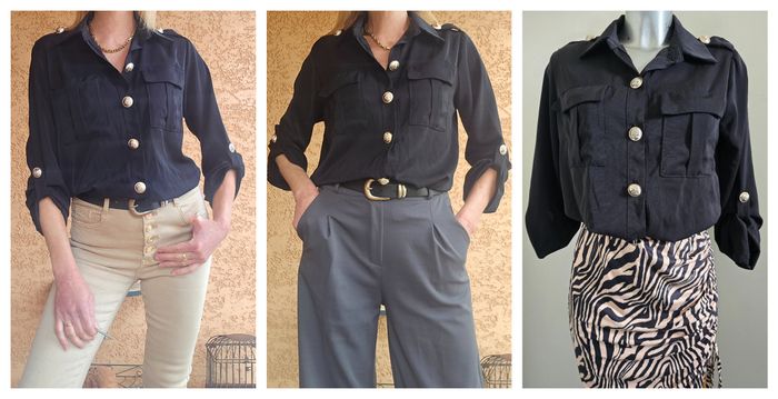 🚩 Bien vérifier les mesures. ✅ Chemisier noir style officier - Inéo Couture - Très bon état - Taille S/M. ✔ Fermeture boutonnée (boutons dorés travaillés sur le devant, les manches et les épaules) ✔ Pattes d'épaules boutonnées ✔ Deux poches poitrine à rabat ✔ Manches retroussables avec patte de boutonnage ✔ Coupe fluide et élégante ✔ Look polyvalent : voir photos n° 4 pour 3 styles différents (avec un jean pour un look casual, un pantalon habillé pour le bureau, ou une jupe pour une touche féminine chic) ✔ Composition : 55 % viscose - 45 % polyuréthane ✔ Dimensions : Longueur 60 cm - largeur d'épaule 38 cm - sous aisselle 51 cm ✔ Envoi rapide et soigné - remise sur lot