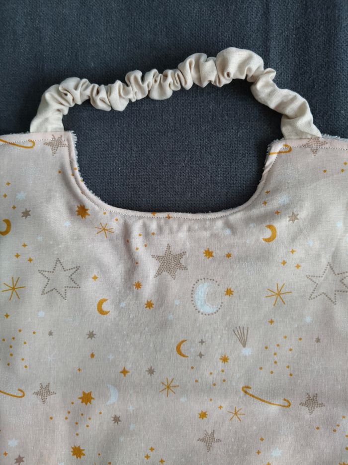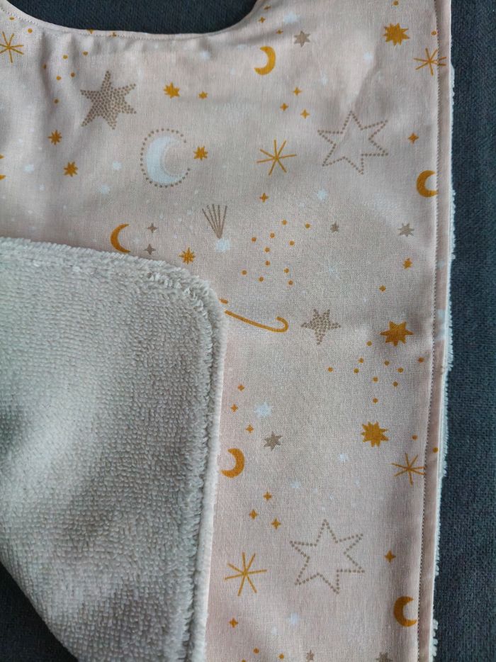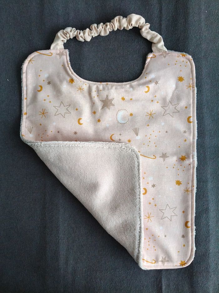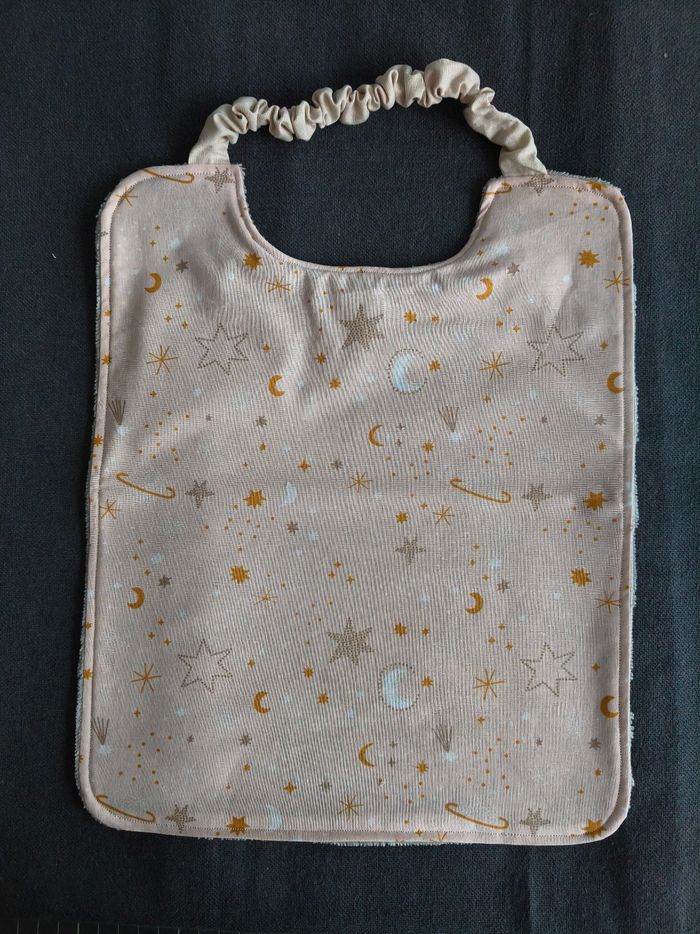 Bavoir avec élastique favorisant l'autonomie de l'enfant  Tissu avant en coton. Tissu arrière éponge bambou, matière douce et très absorbante 📏 32cm de long x 26cm de large Encolure environ 12cm