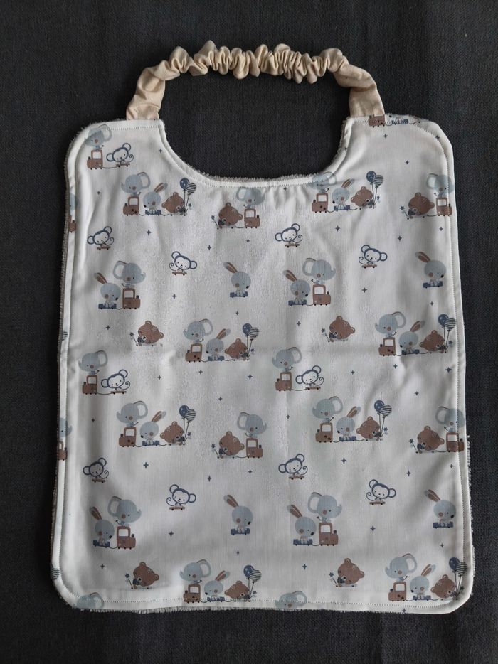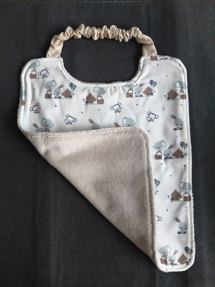 Bavoir avec élastique favorisant l'autonomie de l'enfant  Tissu avant en coton. Tissu arrière éponge bambou, matière douce et très absorbante 📏 32cm de long x 26cm de large Encolure environ 12cm