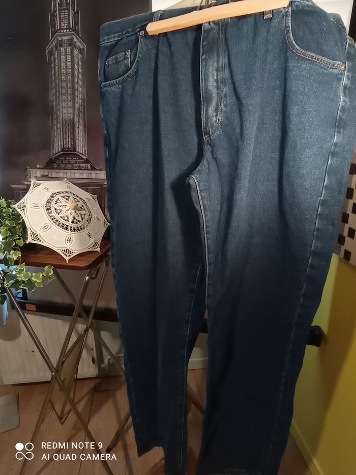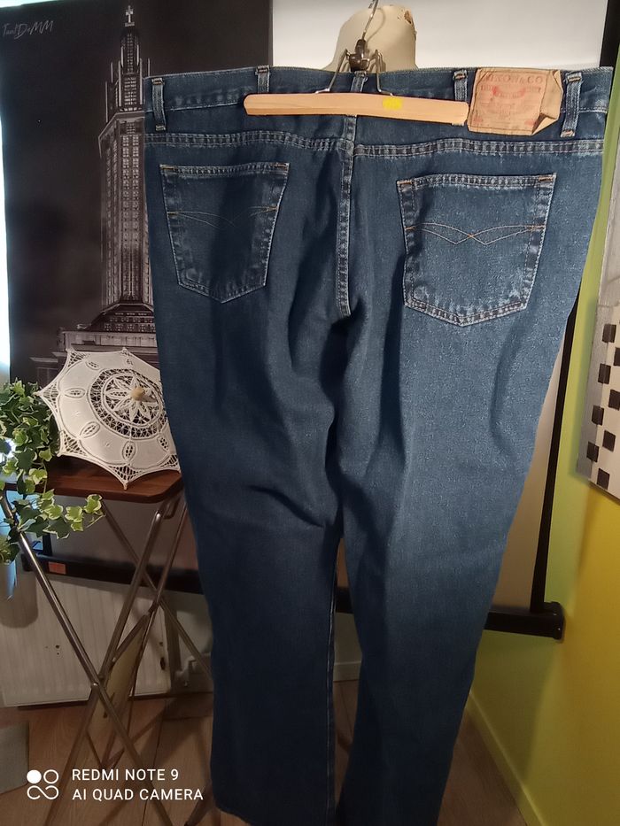 jean bleu grande taille fermé devant par un bouton et une fermeture zippée modèle homme peut aller à une femme deux poches devant et derrière largeur taille 52 longueur jambe 87 largeur cuisse 35 longueur total 114 largeur bas 24
