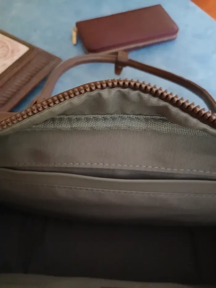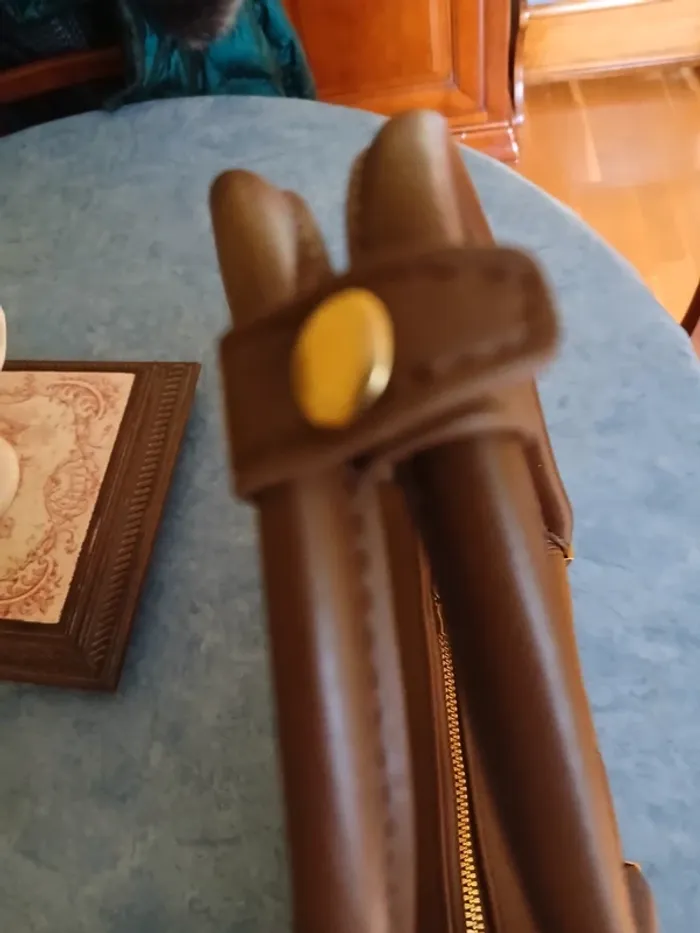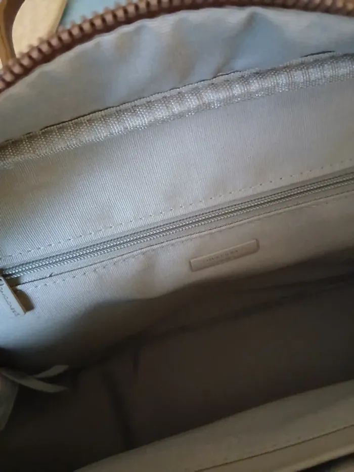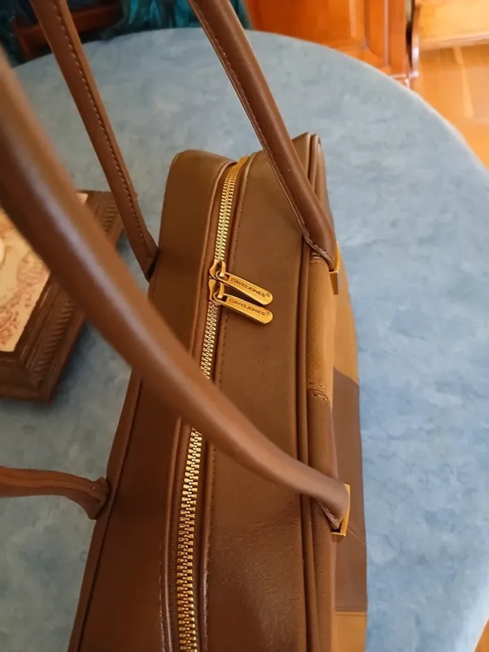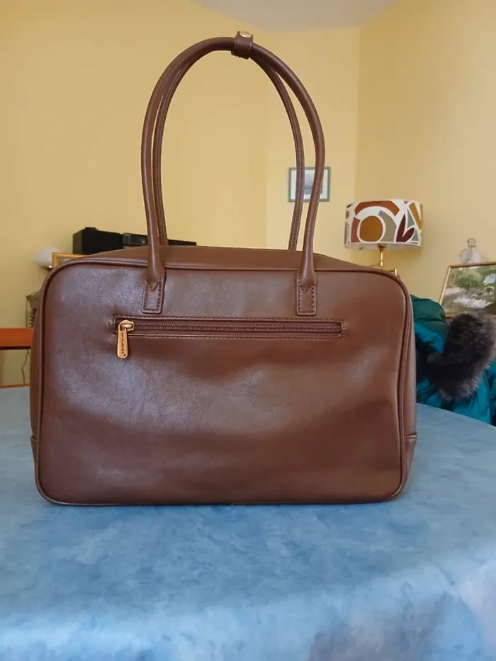 Collection automne hiver, marque david jones, couleur marron, aspect deux matières, synthétique, deux anses avec bouton pression, une poche zippée à l'arrière, plus une autre zippée à l'intérieur et une normale, porté épaule, dimensions : 34X23X10, très bon état