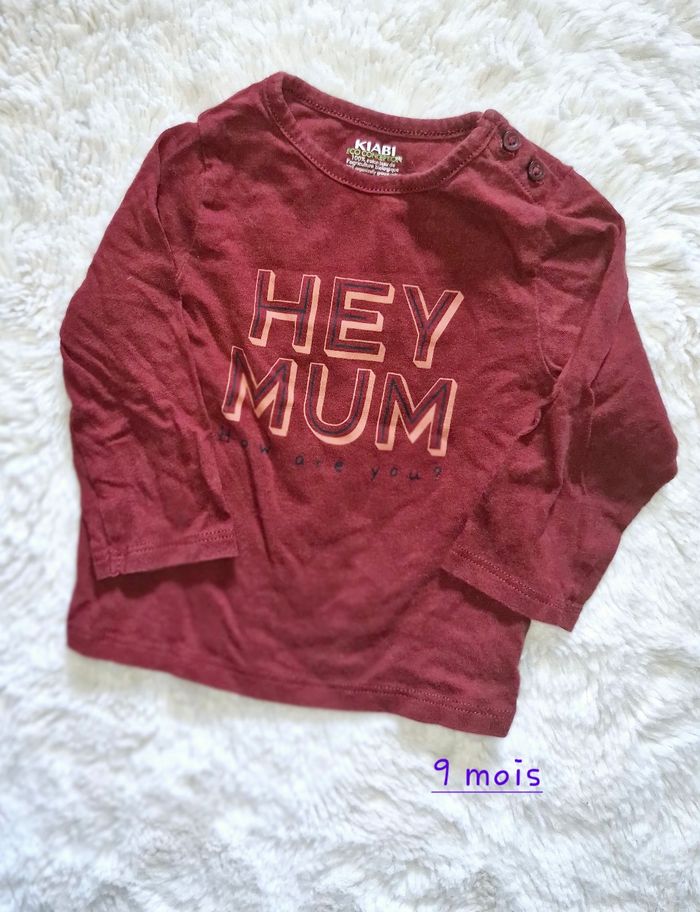 T-shirt manches longues garçon taille 9 mois en excellent état pour 3 euros.