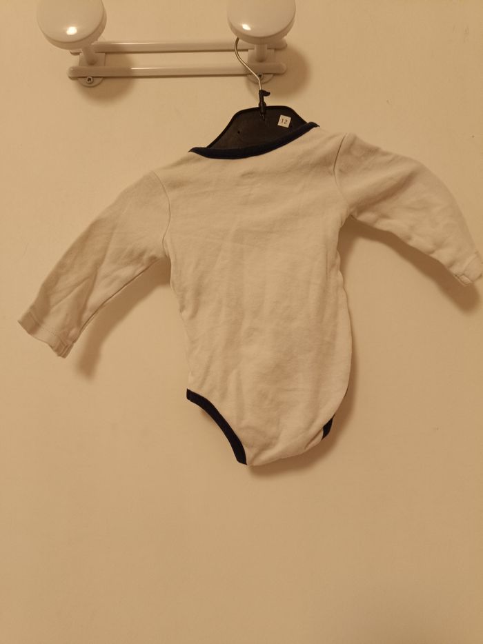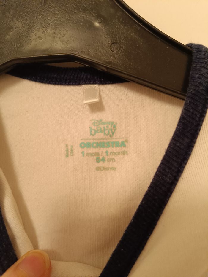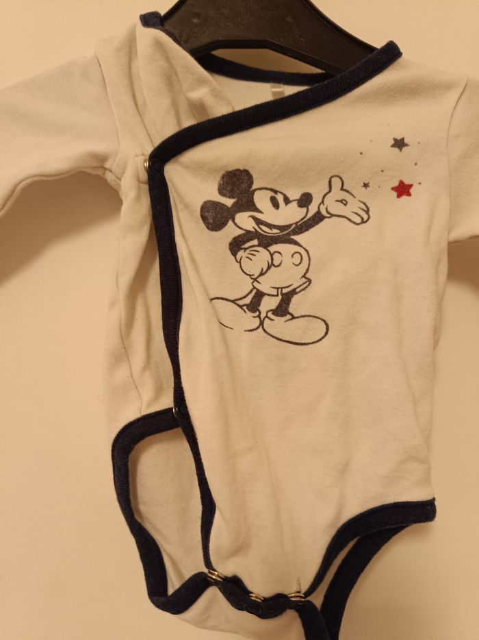 body à manches longues de la marque Orchestra (collection Disney Baby). Motif : Mickey Mouse avec petites étoiles (grise et rouge). Couleur : Blanc cassé / Écru avec liserés bleu marine. Coupe : Forme "cache-cœur" (croisé sur le devant), idéal pour habiller facilement les nouveau-nés sans passer par la tête. Taille : 1 mois (54 cm). État : Très bon état, bien entretenu. Matière : 100% Coton.