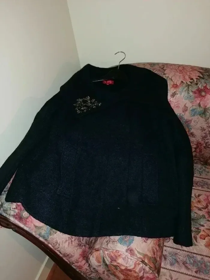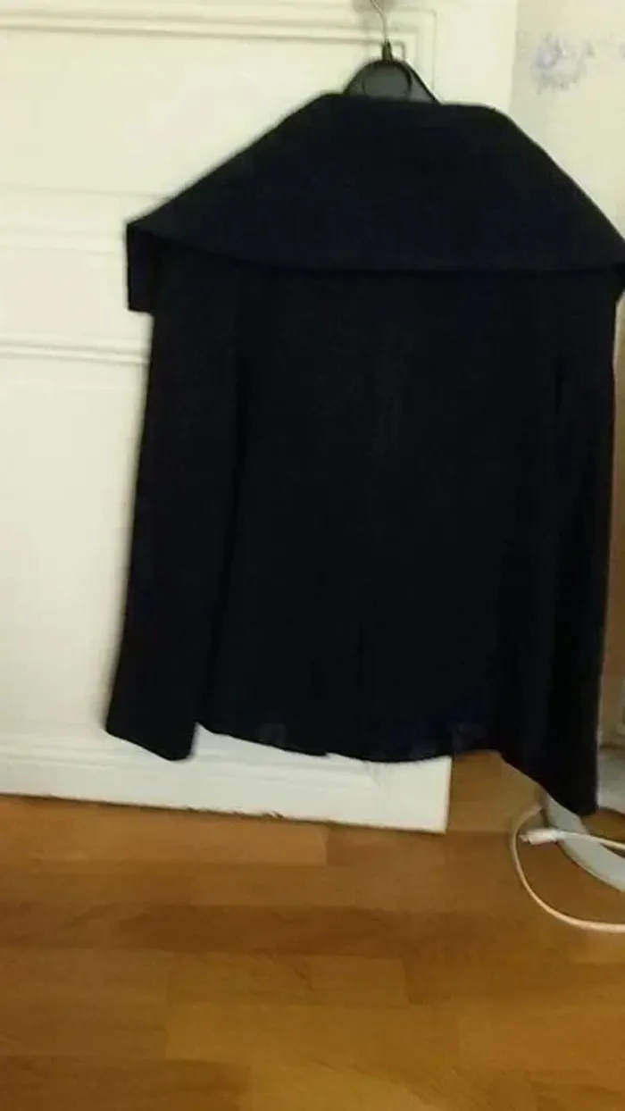 Veste courte et ample, chaude, collection automne hiver, marque rené derhy, taille M (38), couleur bleu marine, col large, se ferme par bouton pressions, deux poches devant, broche cousue sur le col, matière polyester, peu portée, très bon état