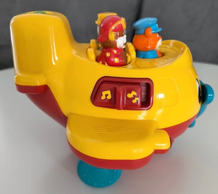 Petit avion intéractif et musical. Plusieurs sons et bruit de décollage et les feux s'allument. Les animaux sortent lorsque l'hélice tourne ou en manipulant les boutons de chaque côté. Les animaux sortent et se cachent quand l'avion roule. A partir de 10 mois