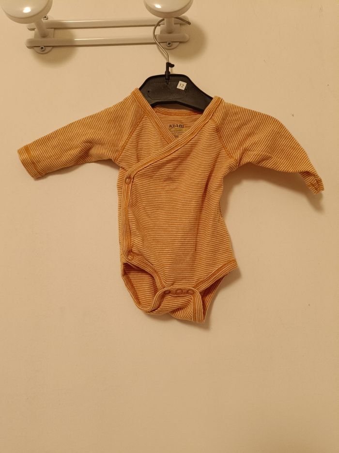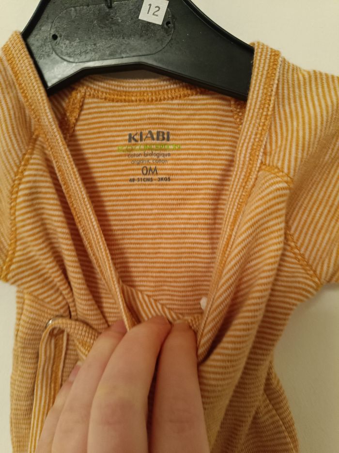 body à manches longues de la marque Kiabi (gamme Éco-conception). Motif : Rayures horizontales fines orange/ocre et blanches. Taille : 0 mois / Naissance (48-51 cm). Coupe : Ouverture croisée (cache-cœur) avec boutons-pression, idéale pour habiller les nouveau-nés en douceur. Matière : 100% Coton biologique. État : Très bon état.