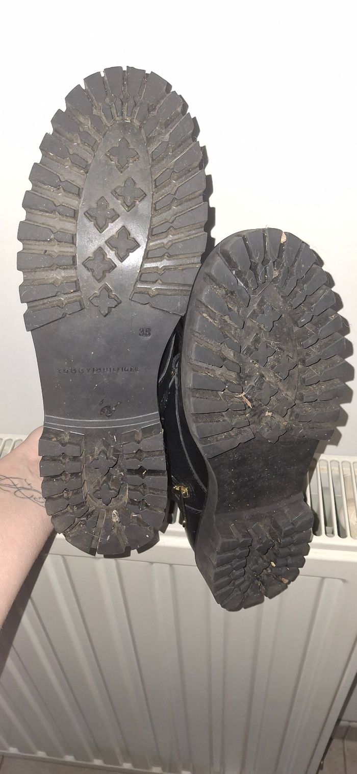 💡 Précision photo : La 1ère et dernière photo est un montage. Les autres photos sont toutes réelles. ​Je vends cette superbe paire de combat boots Tommy Hilfiger en cuir noir, modèle avec boucles et détails dorés. Un look rock et chic, très peu portées ! • ​Marque : Tommy Hilfiger • ​Modèle : Buckle Lace Up Boot • ​Pointure : 38 (UK 6 / USA 7.5) • ​État général : Portées seulement 2 fois. L’extérieur en cuir est en excellent état, les semelles crantées sont quasi neuves. • ​Détails pratiques : Fermetures éclair fonctionnelles sur les côtés avec tirettes logotées. • ​⚠️ À noter (Défaut intérieur) : Comme on peut le voir sur les photos de l'intérieur, la protection au dos d'une des languettes s'est décollée/effritée (là où se trouvait l'étiquette). C’est purement esthétique et totalement invisible une fois les chaussures portées, mais je préfère le préciser.
