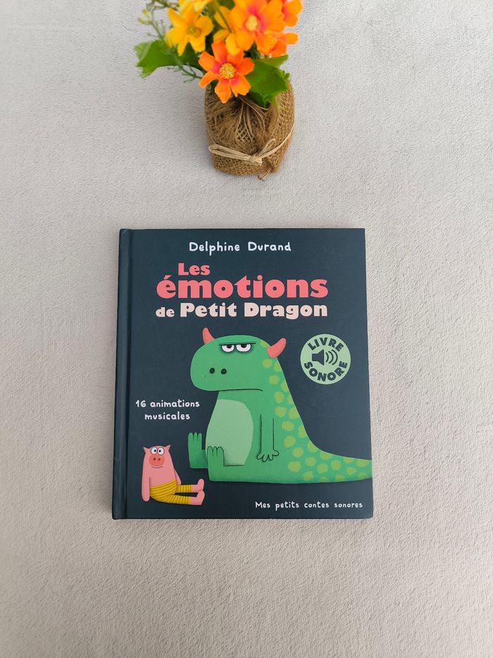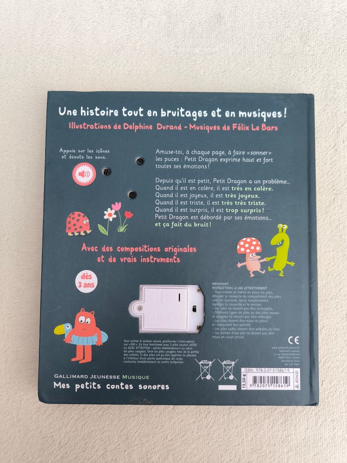 Livre sonore Mes petits contes sonores : Les émotions de Petit Dragon Éditions Gallimard Jeunesse Musique À partir de 3 ans • Une histoire tout en bruitages et en musiques • 16 animations musicales -> Colère, amoureux, joyeux, triste, dégoûté, peur, surpris, débordé -> Musique zen, pompiers, grrr, flammes, ça suffit, au secours • Intérieur du livre en très bon état • Coins légèrement abîmés Fonctionne Piles incluses En très bon état #evelyne_livres