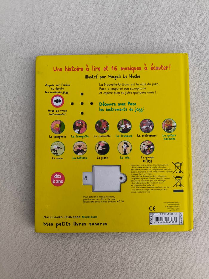 Livre sonore Mes petits livres sonores : Paco et le jazz Éditions Gallimard Jeunesse Musique À partir de 3 ans • Une histoire à lire • 16 musiques à écouter -> Saxophone, trompette, clarinette, trombone, contrebasse, guitare, violon, batterie, piano -> Club de jazz, voix, jazz band... • Intérieur du livre en très bon état • Page avec le trombone abîmée • Bords du livre colorié ⚠️ D'autres livres dans la même collection Fonctionne Piles incluses à changer En très bon état #evelyne_livres