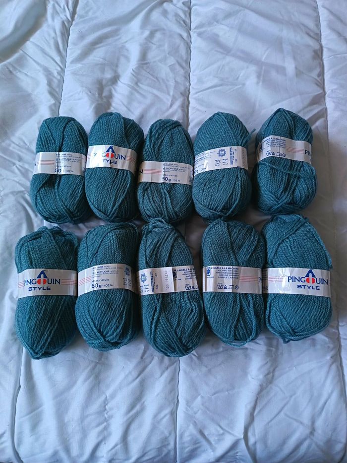 Lot de 10 pelotes de laine "Pingouin" de 50 g (125 m), entre bleu canard et bleu paon (la couleur est bonne sur les photos). Composition : 60% laine/40% acrylique. Fabriqué en France, lavable en machine à 30° sur "cycle laine". Aiguille : 3 1/2-4 et crochet : 4 1/2 ## Envoi SEULEMENT par "Mondial Relay" et "Chronopost" ## PRIX : 25€