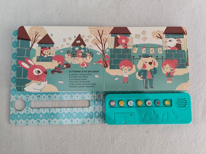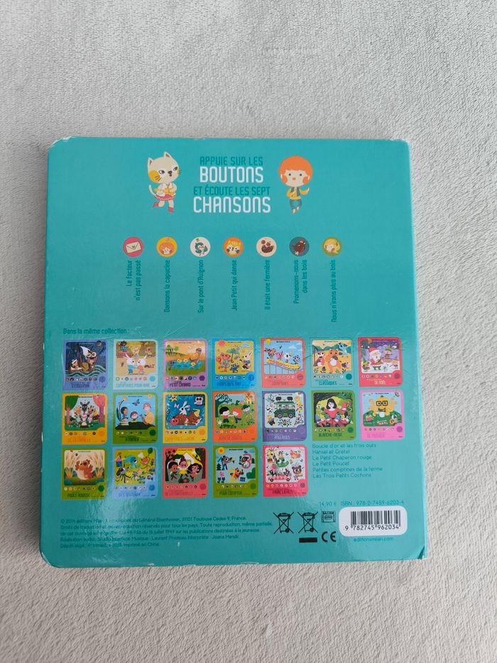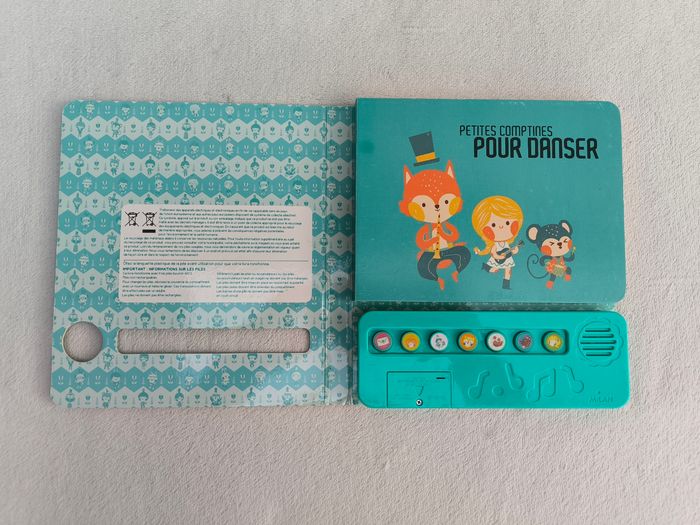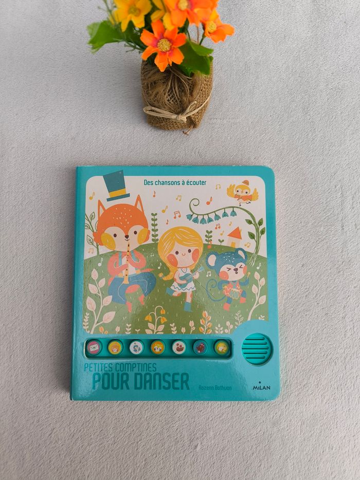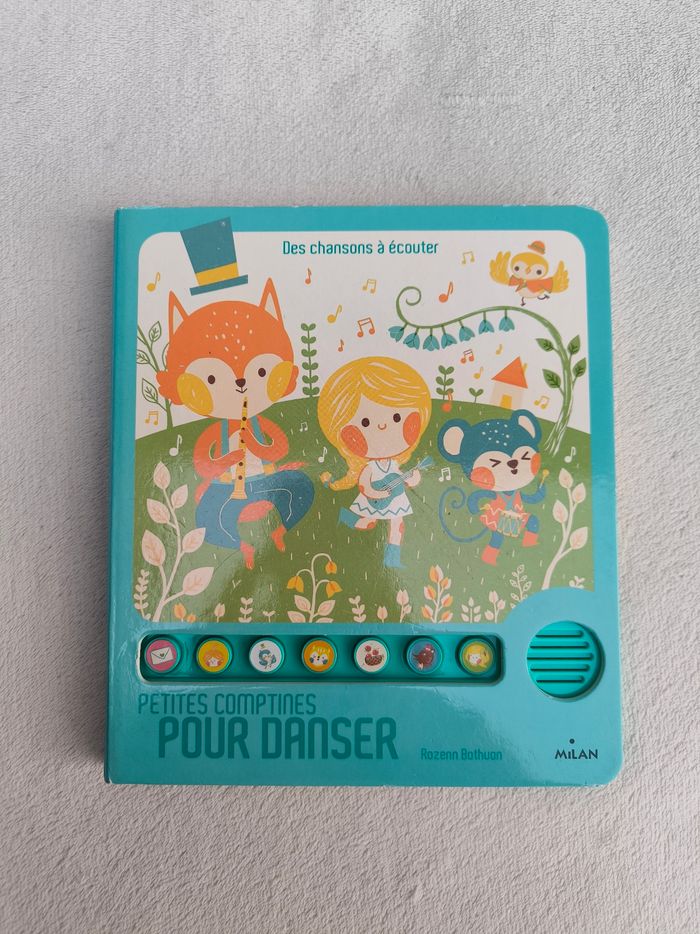 Livre sonore musical Des chansons à écouter : Petites comptines pour danser Éditions Milan • Pages cartonnées • 7 chansons : -> Le facteur n'est pas passé -> Dansons la capucine -> Sur le pont d'Avignon -> Jean Petit qui danse -> Il était une fermière -> Promenons-nous dans les bois -> Nous n'irons plus au bois • Intérieur du livre en très bon état • Coins et arêtes légèrement abîmés, coloris bleu jauni ⚠️ D'autres livres dans la même collection Fonctionne Piles incluses En très bon état #evelyne_livres