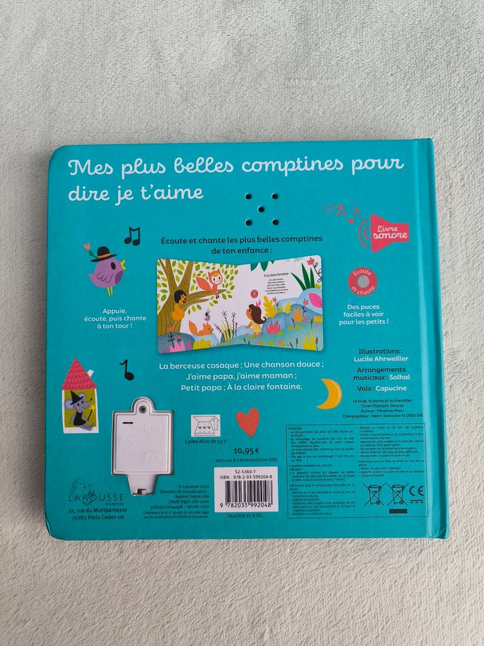 Livre sonore Mes plus belles comptines pour dire je t'aime Éditions Larousse Jeunesse • Pages cartonnées -> Une chanson douce -> J'aime papa, j'aime maman -> Petit papa -> Berceuse cosaque -> À la claire fontaine • Intérieur du livre en très bon état ⚠️ D'autres livres dans la même collection Fonctionne Piles incluses En très bon état #evelyne_livres