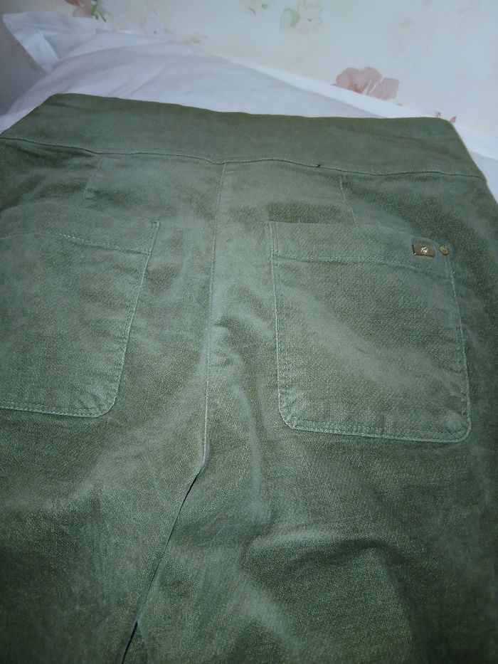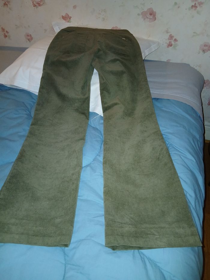 Collection automne hiver, marque patrice bréal, taille 36, velours, matière coton et élasthanne, forme bootcout, deux poches devant avec boutons fantaisie, deux derrière, se ferme par zip et deux boutons, couleur vert kaki, très bon état