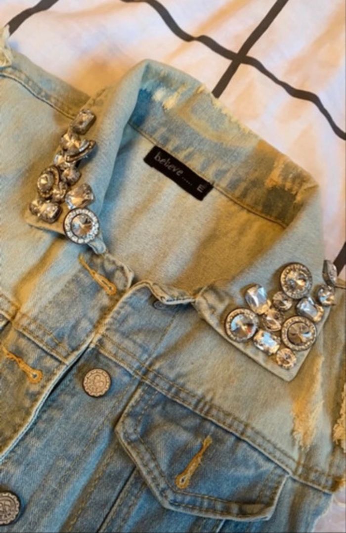 Cette veste est une pièce rock-glam qui mise sur contraste entre un aspect brut et des détails sophistiqués. ✅ Style : Un look résolument "distressed" (usé) avec des emmanchures frangées et effilochées, ainsi que des zones délavées artificiellement pour un effet vintage ✅Ornements : les pointes du col sont richement décorées de cristaux et strass argentés de différentes tailles. 📐Taille : S Remarque : une petite tache sur le devant