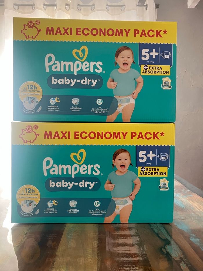 Deux packs soit de 176 couches Pampers baby dry taille 5+ neufs