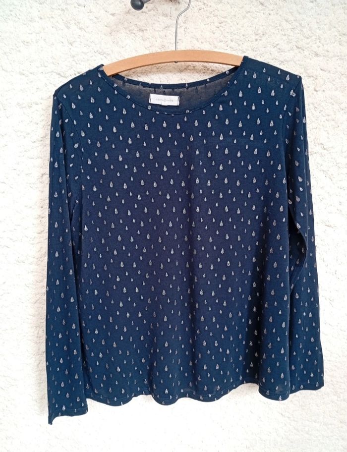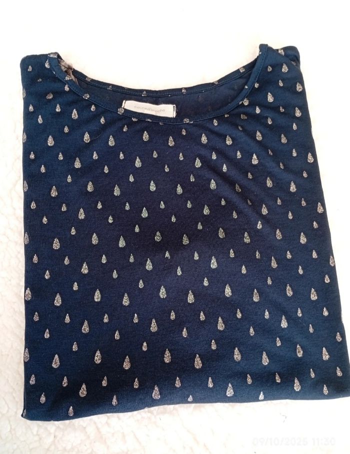 Tee shirt manches longues bleu marine avec gouttelettes argentées . Indiqué T4 mais correspond à une taille 40. Plus d étiquette de composition (coton extensible)