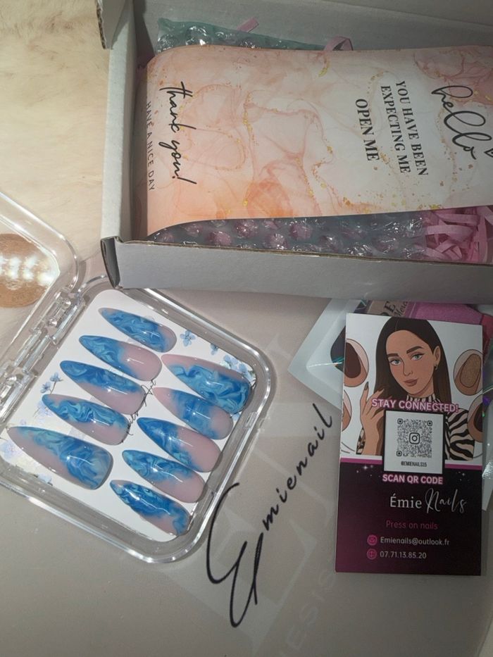 🌸 Bonjour 🌸 Disponible en tailles XS, S, M, L. Merci de m’indiquer votre taille 💖 Bien lire toute la description : ✨ Fournis avec : • une lime • un pousse-cuticules • une lingette nettoyante • une fiche explicative • une colle en stick • une feuille de gels pads (colle) • une carte de fidélité avec des stickers à coller à chaque boîte achetée 💝 Une fois la carte pleine, une boîte offerte au choix ! Si vous avez déjà la carte de fidélité, n’hésitez pas à me le dire : j’enverrai uniquement le sticker à coller sur la vôtre ❤️ 📦 Une fois votre carte pleine, faites-le-moi savoir et choisissez : je m’occupe de l’envoi de la boîte offerte 😍 💡 Aide : ❓ Quelle taille dois-je prendre ? Pour trouver votre taille de Press On Nails, vous devez mesurer la largeur de vos ongles. Un test de mesure très simple (que je vous envoie au moment de votre demande) est réalisable chez vous, à l’aide de seulement trois éléments : 🩹 scotch 🖊️ feutre 📏 règle 💅 Nous avons toutes des ongles différents : plats, larges, bombés, courts, rongés… ➡️ La longueur de vos ongles importe peu. 🌷 Mes conseils : La taille standard est la taille S : elle s’adapte à la plupart des personnes. La taille XS convient aux ongles très fins en largeur. Les tailles M et L sont conseillées pour des largeurs d’ongles plus importantes. ✨ Si vous avez les ongles plats, je vous conseille de choisir une taille au-dessus. ✨ Si vous hésitez entre deux tailles, je vous conseille de prendre la taille en dessous pour un résultat qui durera plus longtemps. 📸 Si vous hésitez toujours, vous pouvez m’envoyer une photo de vos mains, ongles bien visibles, avec une pièce de 20 centimes à côté. Je pourrai ainsi regarder la taille réelle 💕 💖 À bientôt, prenez soin de vous, Émienail’s 💅