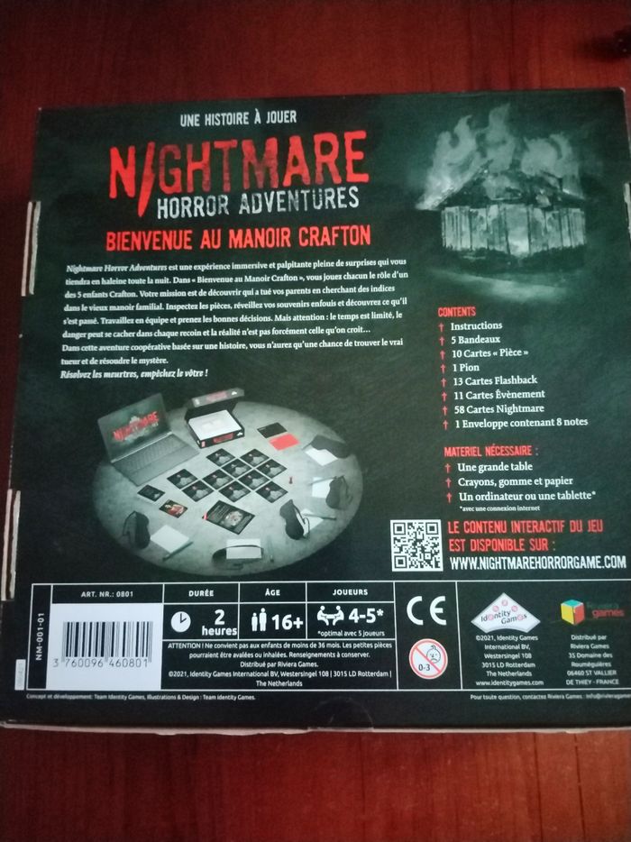 Plateau de jeu d'horreur entièrement neuf. Jamais ouvert. Ce jeu est une expérience immersive et pleine de surprises. C'est un jeu de rôle ou vous jouer l'un des enfants de la famille. Il vous faudra chercher et trouver des indices afin de trouver le meurtrier et d'empêcher votre meurtre... Envoi rapide