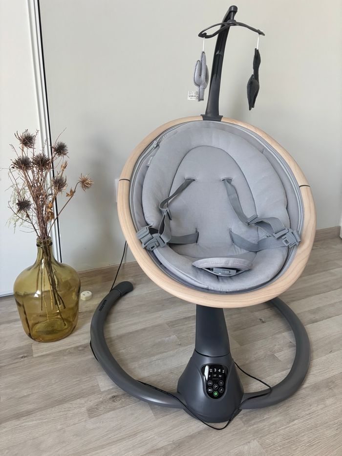 Je vends cette balancelle Maxi Cosi Cassia elle se balance toute seule avec arrêt automatique temps à sélectionner on peut aussi également mettre l’option musique État comme neuf presque pas utilisée achetée en 2025 à 179 euros Remise en main propre