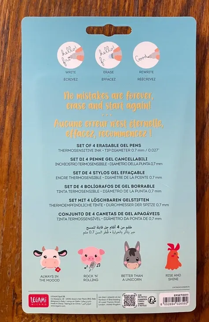 Je vends ce lot de 4 stylos effaçables de la marque Legami, de la collection "Farm Sweet Farm". Parfaits pour l'école ou le bureau ! - Type de produit : Lot de 4 stylos effaçables - Marque : Legami - Collection : Farm Sweet Farm - Fonctionnalités : Stylos à encre gel effaçable État neuf. N'hésitez pas à me contacter pour toute question ! envoie possible