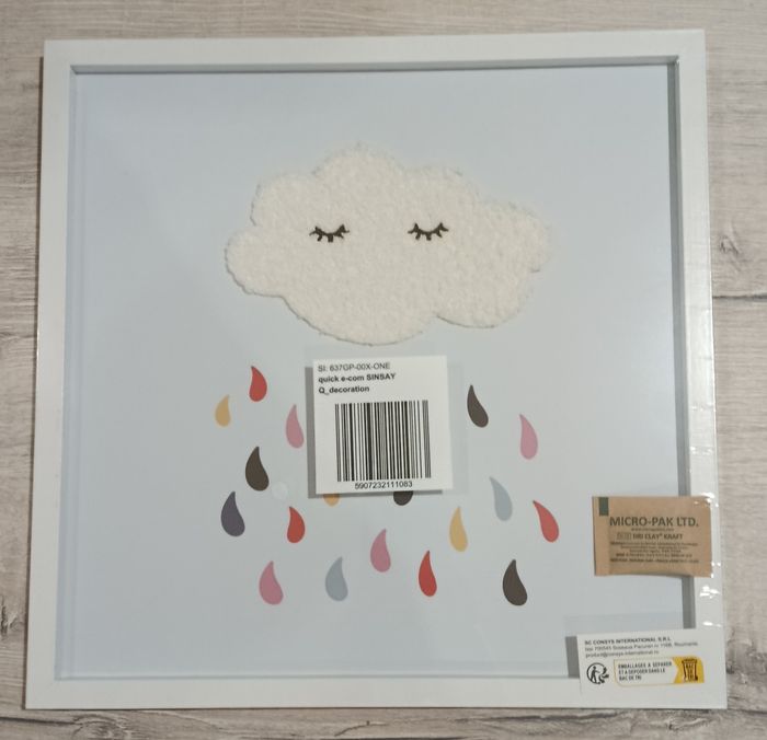 Tableau décoratif 30x30 nuage Emballé sous film plastique. Information: J'ai fait le choix de ne pas enlever l'étiquette du fabriquant afin de ne pas prendre le risque de dégrader l'emballage.