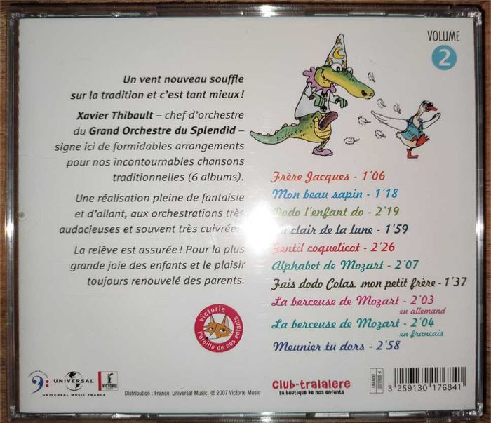 🎵 Jolies chansons d'enfance 🎵 Volume 2 CD 10 titres 1 - Frère Jacques 2 - Mon Beau Sapin 3 - Dodo L'enfant Do 4 - Au Clair De La Lune 5 - Gentil Coquelicot 6 - Alphabet De Mozart 7 - Fais Dodo Colas, Mon Petit Frère 8 - La Berceuse De Mozart (En Allemand) 9 - La Berceuse De Mozart (En Français) 10 - Meunier Tu Dors .