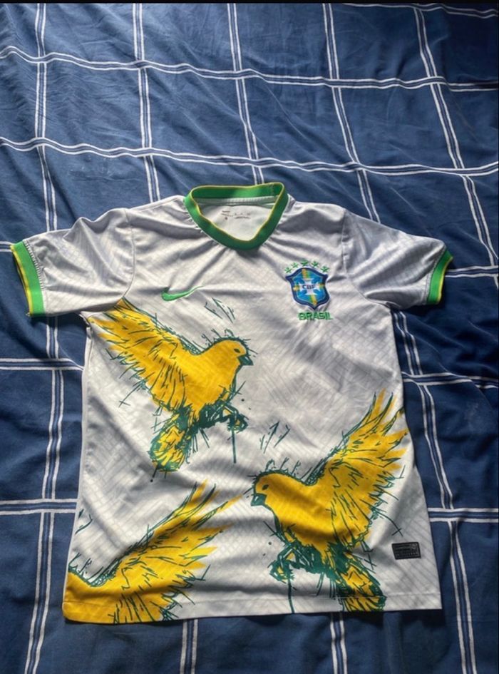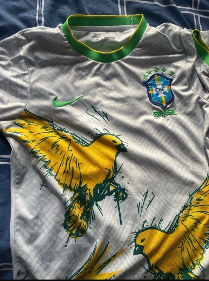 Maillot de foot Brésil, Nike, taille, S en vert, jaune et blanc avec des oiseaux porter quelques fois et il est lavé