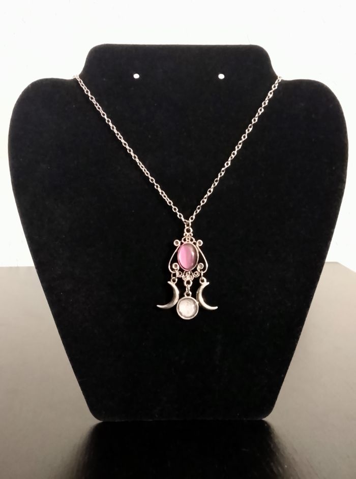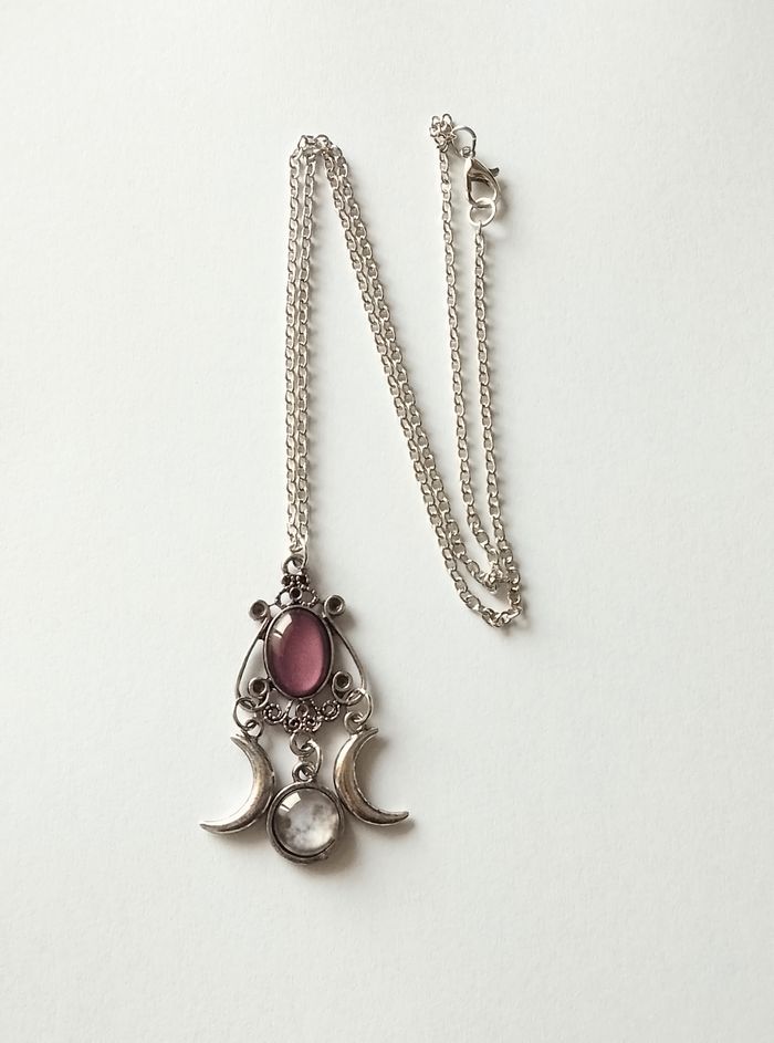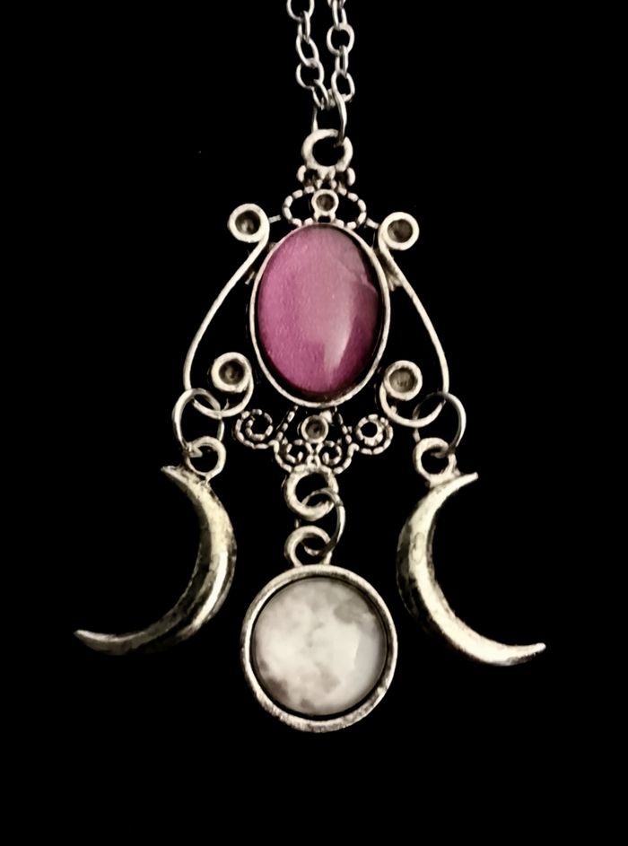 Chaîne + pendentif celtique. Pendentif : triple lune déesse. (celtique, spirituel, bohème, ethnique, boho-chic, élégant, idéal cadeau) DESCRIPTIF : Couleur : argenté, violet, blanc. Taille chaîne : 50 cm Diamètre pendentif : 2,5 cm L * 4,8 cm H. Envoi rapide et soigné.